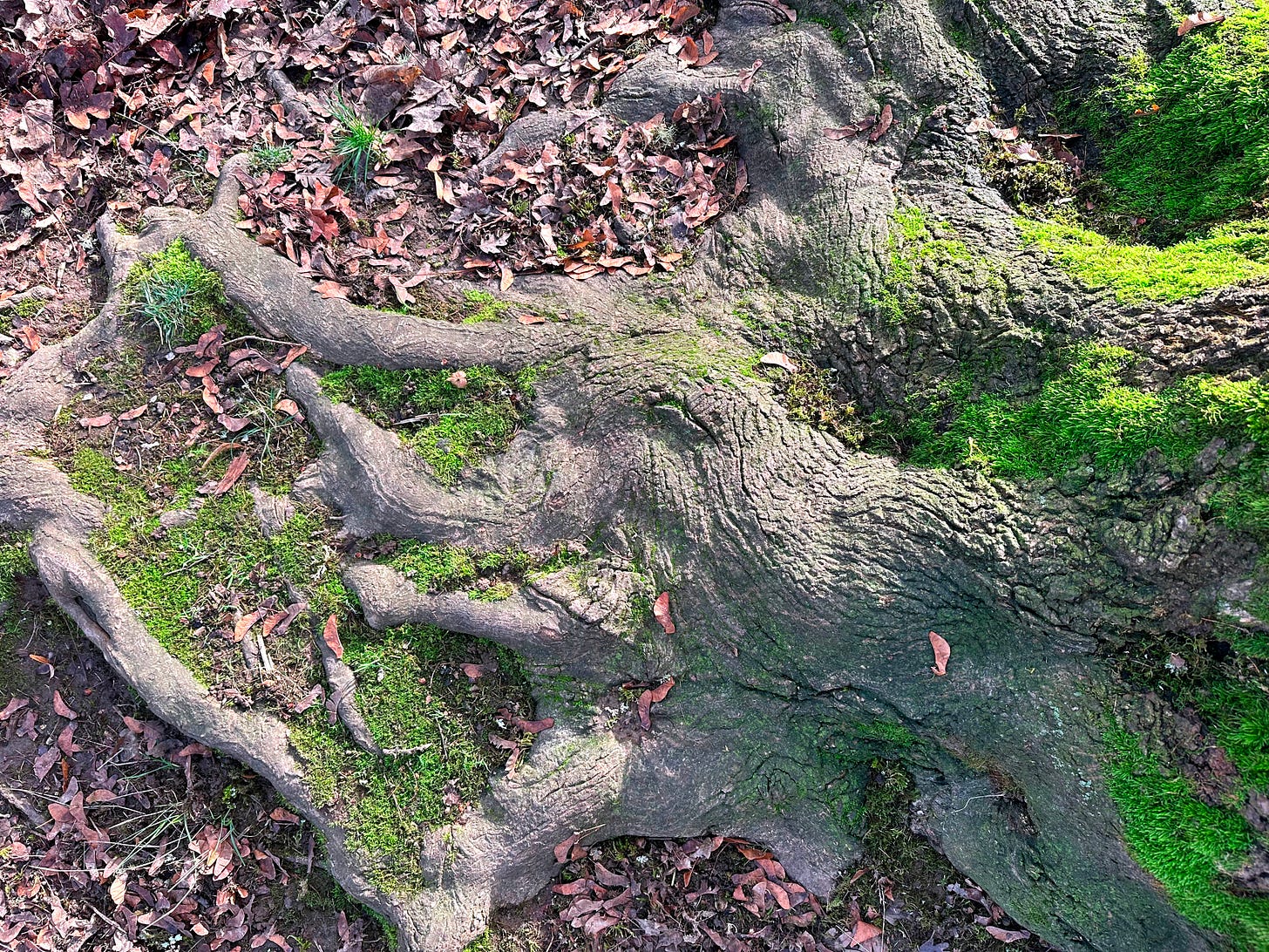I’ve been noticing the roots of the trees at my local park lately - how they sprawl and weave, diving deep into the earth. I can imagine the breadth of their descent into the dark, rich soil - so much life beneath my feet I cannot reach nor observe, but I know it’s there.